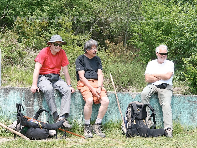 Mit herrlichen Fernblicken belohnen uns zwei "Passhöhen" von jeweils etwa 720 m Höhe. Im Wechsel entlang von Feldern und Wiesen, über Nebenstraßen und durch Pinienwälder wandern wir nach Palas de Rei. Mittendrin machen wir Station in Portomarín. Malerisch oberhalb eines Stausees gelegen, hat der Ort eine besondere Geschichte. Was so ungewöhnlich daran ist, verrät uns der Reiseleiter beim Betreten der historischen Pilgerbrücke. |