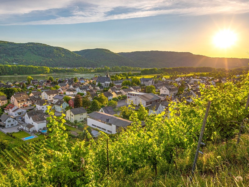Von Leutesdorf aus macht der Rheinsteig einen reizvollen Abstecher in den herrlichen Westerwald – und der hat’s in sich! Gleich zu Beginn erwartet dich die "Schönste Weinsicht Mittelrhein 2012" – ob die Aussicht den Titel wert ist, kannst du selbst bewerten. Der Blick schweift über die lieblichen Weinbergterrassen hinab zum silbern glänzenden Rhein. Ein echtes Postkartenmotiv!